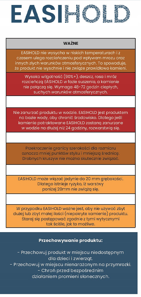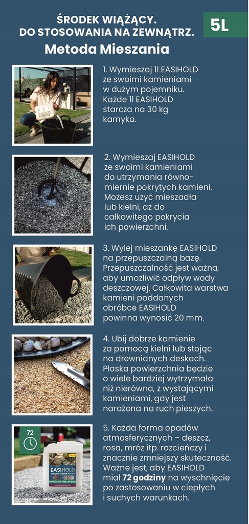 EASIHOLD to innowacyjne spoiwo źwirowe do klejenia kamieni, kory i żwiru. Produkt zapewnia stabilność i estetyczny wygląd nawierzchni, eliminując problem luźnych kamyków. Doskonały do stosowania na tarasach, ścieżkach ogrodowych i obrzeżach.Zalety EASIHOLD: