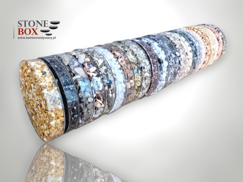Prezentowany wzornik to profesjonalna próbka systemu kamiennego dywanu, dostępna w serwisie www.kamiennedywany.pl. Produkt przedstawia kruszywo zatopione w wysokiej jakości żywicy, zamknięte w poręcznym pojemniku o średnicy 10 cm (fi 10).