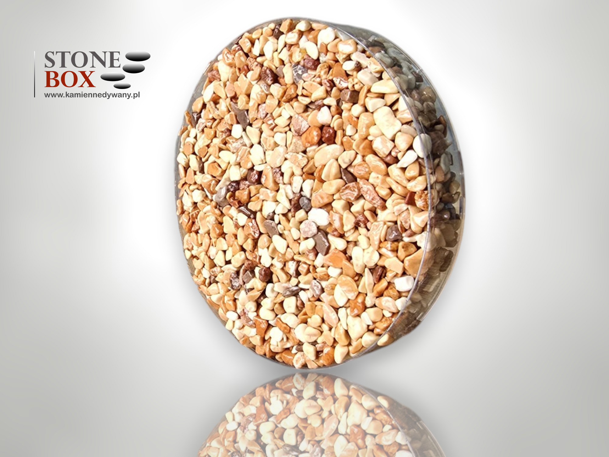 Prezentowany wzornik to profesjonalna próbka systemu kamiennego dywanu, dostępna na www.kamiennedywany.pl. Produkt przedstawia kruszywo zatopione w wysokiej jakości żywicy, zamknięte w poręcznym pojemniku o średnicy 10 cm (fi 10).