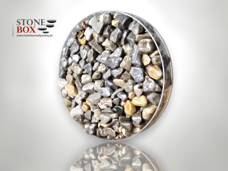Prezentowany wzornik to profesjonalna próbka systemu kamiennego dywanu, dostępna na www.kamiennedywany.pl. Produkt przedstawia kruszywo zatopione w wysokiej jakości żywicy, zamknięte w poręcznym pojemniku o średnicy 10 cm (fi 10).