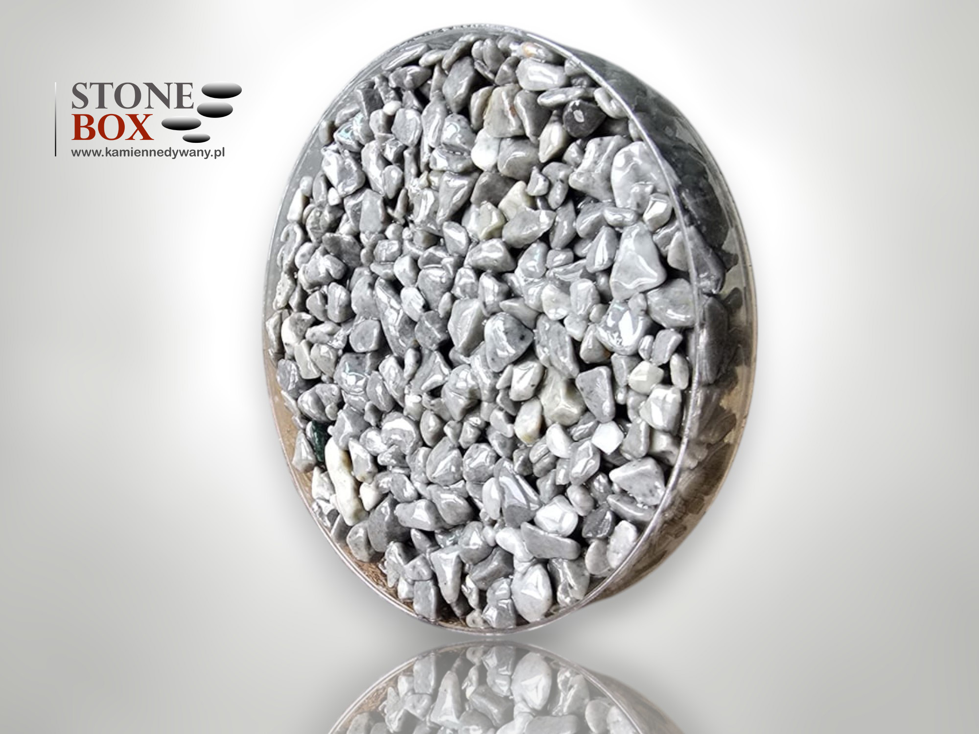 Prezentowany wzornik to profesjonalna próbka systemu kamiennego dywanu, dostępna na www.kamiennedywany.pl. Produkt przedstawia kruszywo zatopione w wysokiej jakości żywicy, zamknięte w poręcznym pojemniku o średnicy 10 cm (fi 10).
