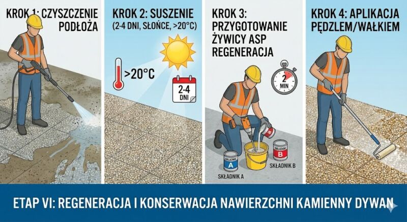 4. Aplikacja Rozprowadzanie: Wymieszany materiał wylej na nawierzchnię “Kamiennego Dywanu” i rozprowadź równomiernie za pomocą gumowej rakli (nazywanej też fugownicą). Wykończenie (Ważne!): Aby uzyskać estetyczny wygląd końcowy, bezpośrednio po rozprowadzeniu żelu raklą, całą powierzchnię należy przewałkować za pomocą wałka do lakieru o średniej długości włosia.