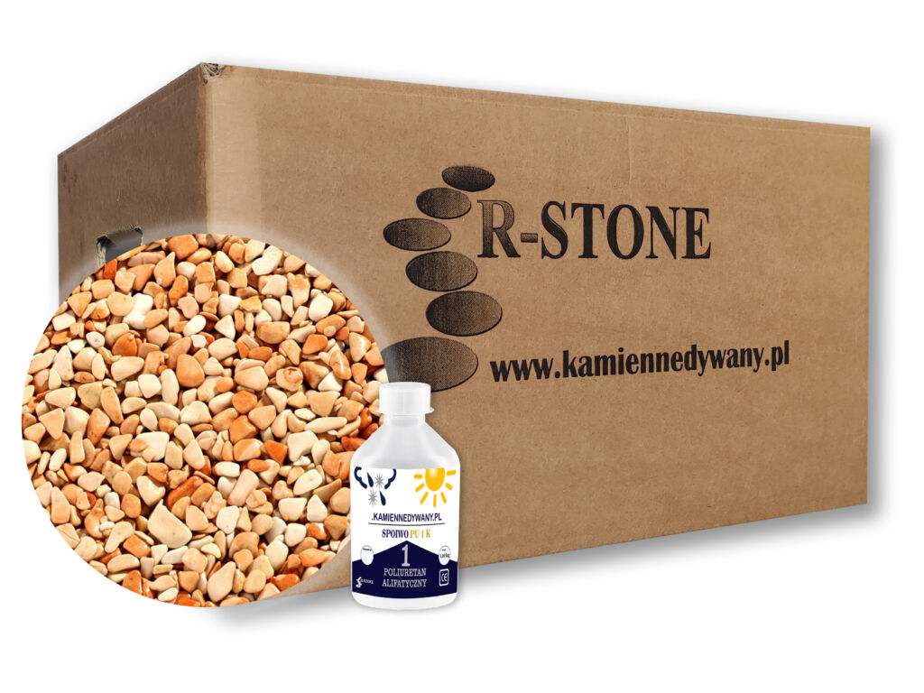 Zastosowanie PU 1 K przy wykonaniu kamiennego dywanu ułatwi nam pracę. Jednoskładnikowe spoiwo PU 1 K jest porcjowane i odważone w pojemnikach po 0.70 kg (na 17 kg kruszywa) i po 1.0 kg ( na 25 kg kruszywa) w zależności od zakupionej opcji zestawu. Spoiwo znajdujące się w butelce wystarczy odkręcić i zalać suche kruszywo przygotowane w wiadrze i następnie połączyć kruszywo z żywica za pomocą mieszadła. W celu uzyskania najlepszego rezultatu zaleca się stosowanie PU 1 K w temperaturze od 5 do 30 stopni C.