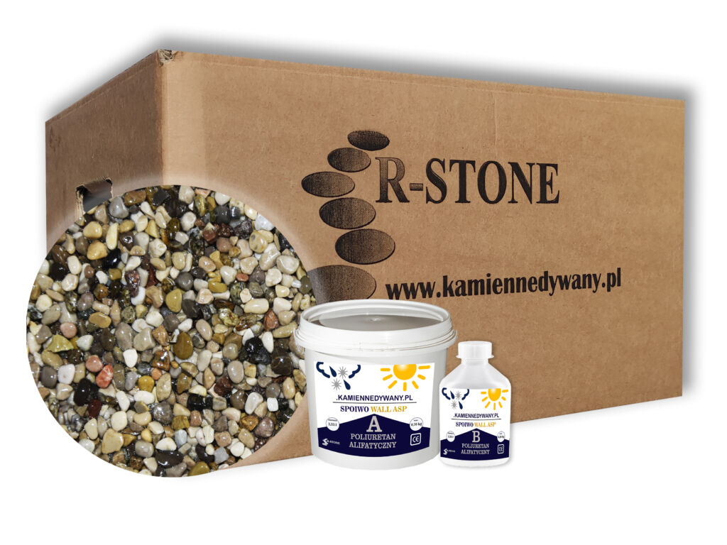 - Spoiwo do kruszywa na piony WALL ASP lub WALL 6022 w ilości 1,5 kg żywica dwuskładnikowa, poliuretan alifatyczny . 100% odpornej na promieniowanie słoneczne UV.