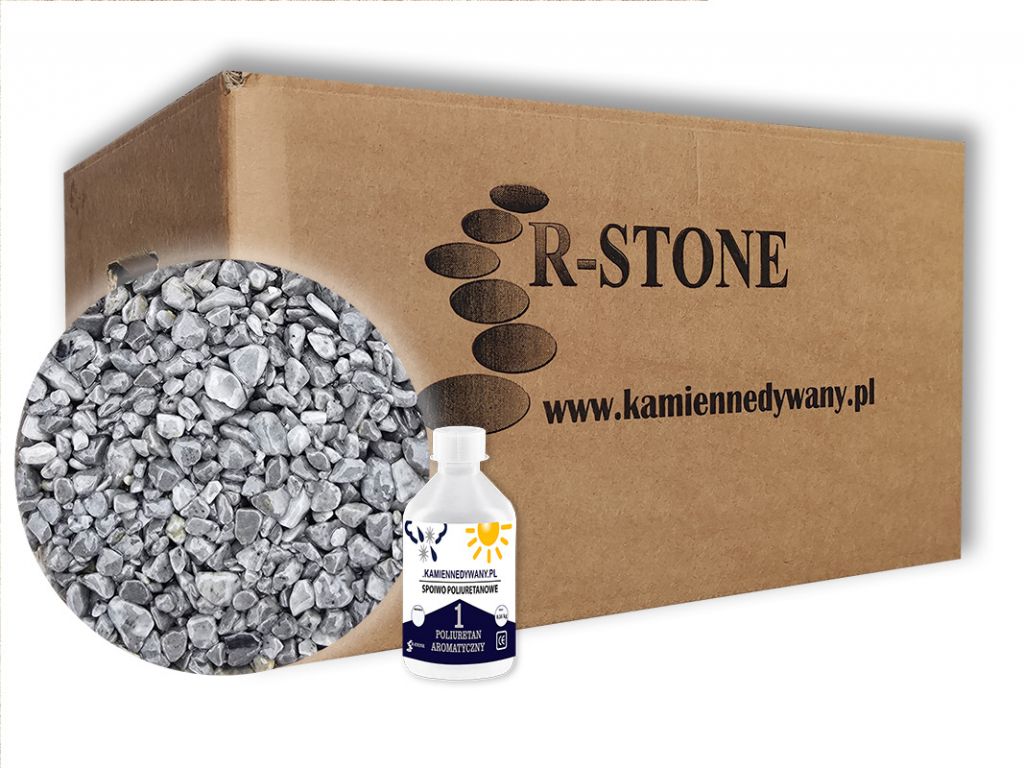 Zastosowanie PU 1 K przy wykonaniu kamiennego dywanu ułatwi nam pracę. Jednoskładnikowe spoiwo PU 1 K jest porcjowane i odważone w pojemnikach po 0.70 kg (na 17 kg kruszywa) i po 1.0 kg ( na 25 kg kruszywa) w zależności od zakupionej opcji zestawu. Spoiwo znajdujące się w butelce wystarczy odkręcić i zalać suche kruszywo przygotowane w wiadrze i następnie połączyć kruszywo z żywica za pomocą mieszadła. W celu uzyskania najlepszego rezultatu zaleca się stosowanie PU 1 K w temperaturze od 5 do 30 stopni C.