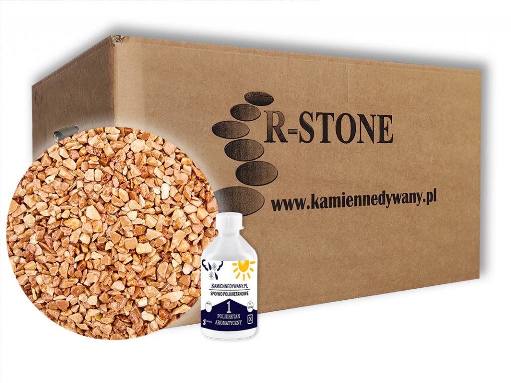 Zastosowanie PU 1 K przy wykonaniu kamiennego dywanu ułatwi nam pracę. Jednoskładnikowe spoiwo PU 1 K jest porcjowane i odważone w pojemnikach po 0.70 kg (na 17 kg kruszywa) i po 1.0 kg ( na 25 kg kruszywa) w zależności od zakupionej opcji zestawu. Spoiwo znajdujące się w butelce wystarczy odkręcić i zalać suche kruszywo przygotowane w wiadrze i następnie połączyć kruszywo z żywica za pomocą mieszadła. W celu uzyskania najlepszego rezultatu zaleca się stosowanie PU 1 K w temperaturze od 5 do 30 stopni C.
